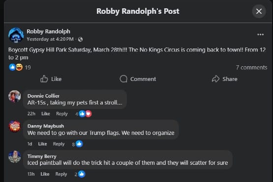 “Boycott Gypsy Hill Park Saturday, March 28th!!! The No Kings Circus is coming back to town!! From 12 to 2 pm.”