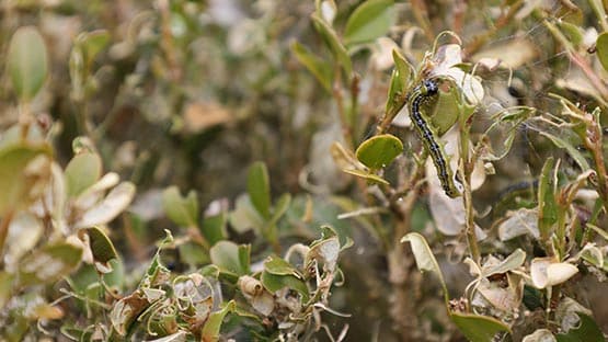 Box tree moth caterpillars feed directly on the leaves of boxwood shrubs and can completely strip a plant of its leaves and bark, according to a Virginia Tech entomologist.