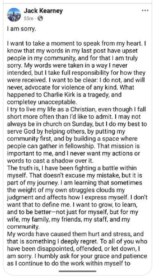 As the furor shifted from the Landes post to the pages of The Buckhorn Inn, its operators and its employees, Jack Kearney posted an apology online: