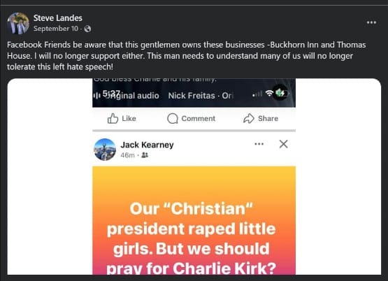 That was the post – Trump raped kids, and we’re supposed to pray for a guy who made excuses for him? – made and later deleted, by Jack Kearney, the operator at The Buckhorn Inn, which Jack and his wife, Brenda, took over as tenants in 2021.