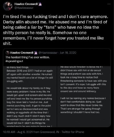 Cromwell, in the tweet, alleged that a person that she originally didn’t name, but later confirmed was Allin, “ruined my mental health on a lot of things I’m still struggling with,” specifically accusing him of rape, dating to their on-again, off-again relationship in 2016 and 2017.