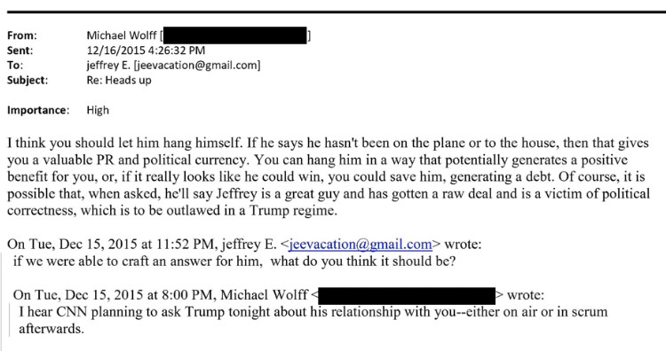 The first, from 2015, was an exchange initiated by Wolff, who wrote to Epstein about an upcoming CNN interview with Trump that Wolff said he had heard may involve a question about Trump’s relationship with Epstein.