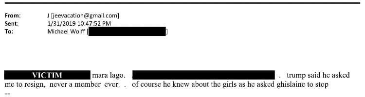 The final email released today is a standalone, from Epstein to Wolff, dated Jan. 31, 2019, five months before Epstein was arrested by the Trump DOJ on federal sex-trafficking charges dating back to 2002.