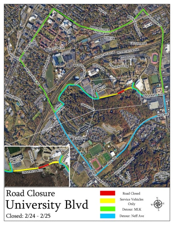 Work will begin at 7 a.m. on Tuesday and continue until 3 p.m. on Wednesday. The stretch of University Boulevard will not be accessible to through traffic during this time.