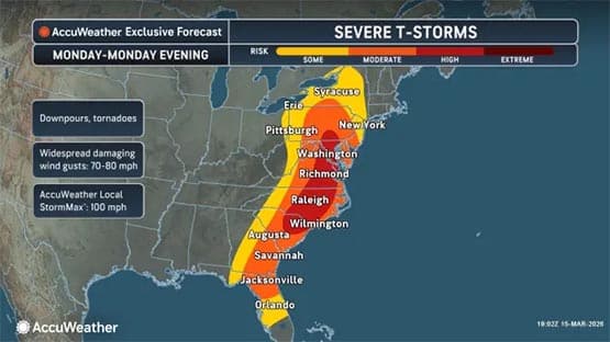 “A few tornadoes, including the possibility of an especially intense tornado, cannot be ruled out, especially from near the Baltimore and Washington, D.C., metro areas through Virginia and into North Carolina,” said AccuWeather Chief Meteorologist Jon Porter.