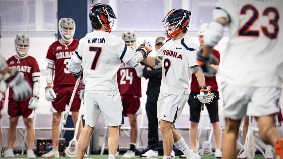 Virginia got six goals from Truitt Sunderland, and four goals each from McCabe Millon and Ryan Colsey, in a 19-14 win over Colgate on Sunday, in the first-ever game played inside the George Welsh Indoor Football Practice Facility.