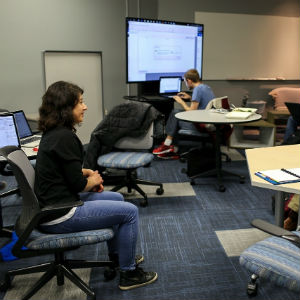 On Wednesday nights, this interdisciplinary group of students, faculty, and community members meets to further develop the game called Our Pandemic: 1918 in the Fusion Studio. Located in Room 2038 on Newman Library’s second floor, this new space, equipped with modular desks and technology designed for creative brainstorming and collaborative work, was built with groups like this in mind.