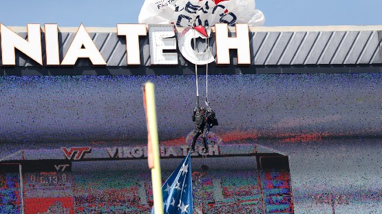 Only one of the members of the three-skydiver team – Team Fastrax Professional Skydiving, which boasts a roster of more than 40 active members with cumulative 175,000 skydives – actually made it onto the field as planned; a second skydiver landed on the practice field located adjacent to Lane Stadium.