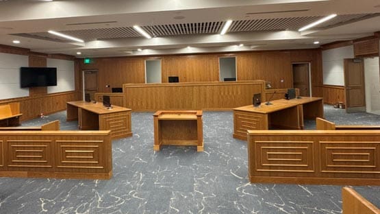 The new 34,000-square-foot J&DR building includes two courtrooms, secure program areas for the city sheriff’s office, clerk’s office and court service unit, as well as satellite office space for the commonwealth’s attorney, public defender and mediator/victim advocate services.