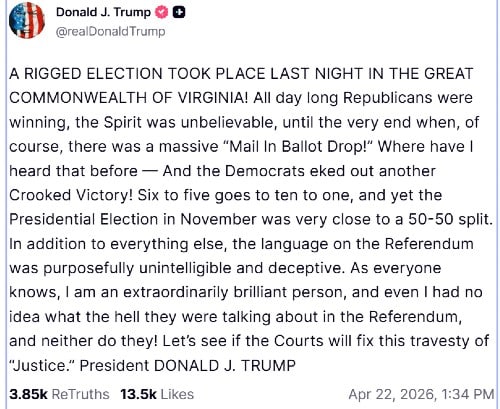 Donald Trump has finally weighed in on the Virginia “Yes” vote, calling the result, predictably, “rigged,” because that’s what he knows.