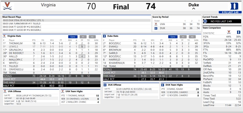 Duke (32-2) led 38-36 at the half, got the lead to five in the opening minute of the second half on an Isaiah Evans three, then, Virginia (29-5) countered with a 13-4 run that got the ’Hoos up four.