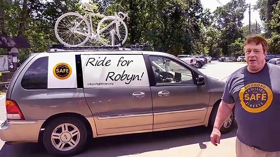 He also honors Robyn’s legacy through a website and a memorial of sorts, a white bike, known as a ghost bike, mounted on the top of his vehicle.