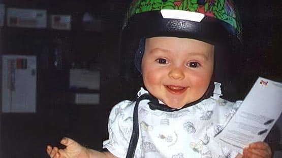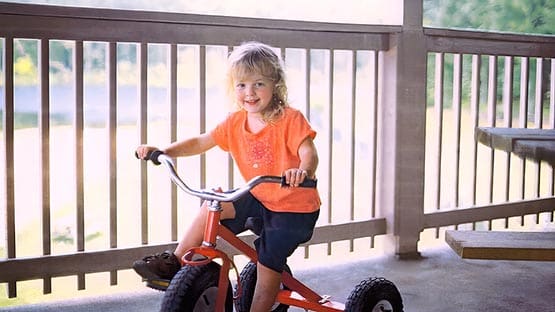 Photos of Robyn show them in their first bicycle helmet as a toddler; and on their first tricycle as a child.