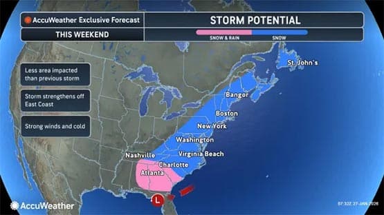 “This is a dangerous stretch of winter weather for the eastern half of the nation,” said Carl Erickson, AccuWeather director of forecasting operations. “The combination of extreme cold and back-to-back winter storms in the span of a week raises the risk of widespread and costly disruptions for millions of people.